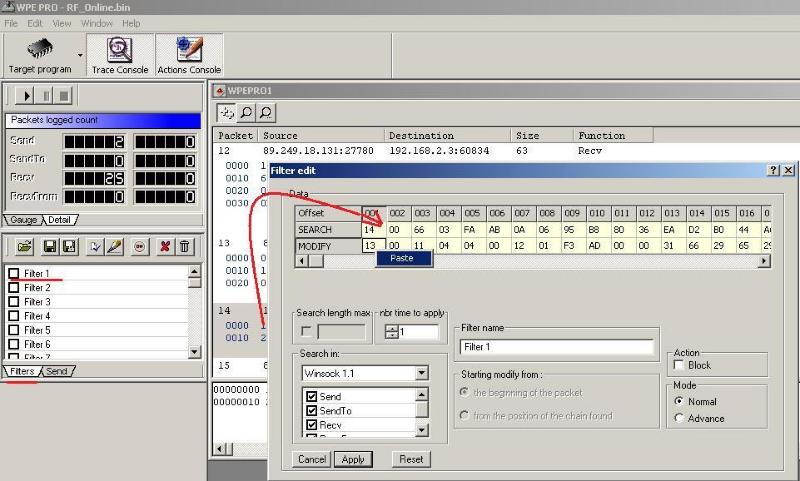 Потом я перехожу в закладку Send 2-й клик по пакету баффа ярость, копирую, перехожу в закладку filter, кликаю 2 раза по filter1 и в строчку Search в первый слот (001 по оффсету) вставляю скопированный пакет, затем кликаем по apply. Делаю то же самое с пакетом на точность, только его вставляю в строку Modify тоже в 1 слот, затем тык apply.