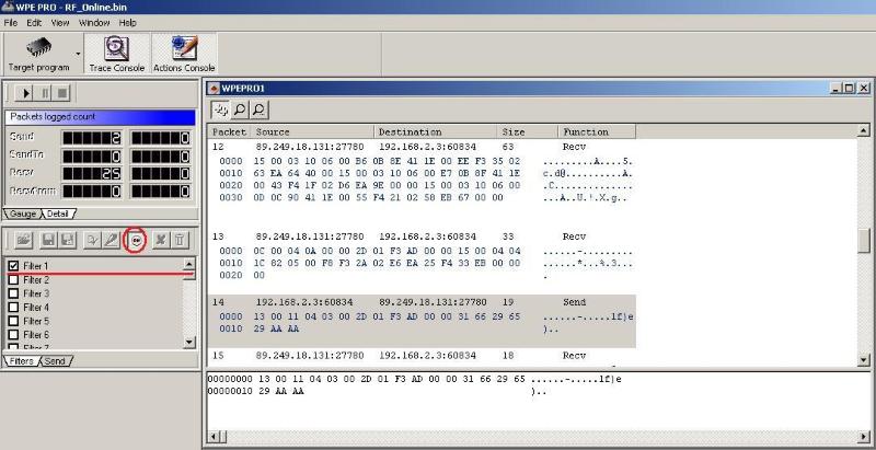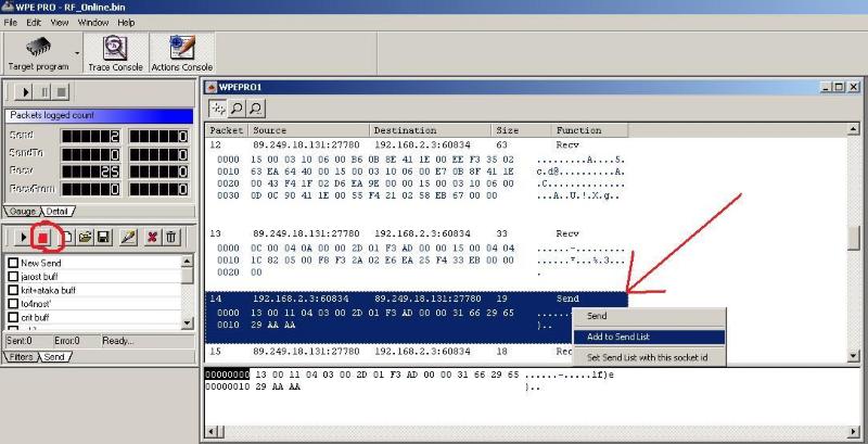 Я нажал на черный треугольник (на скрине обведен), затем переключился в окно RF и бафнул на себя ярость, затем остановил отлавливание пакетов, нажатием красного квадрата.