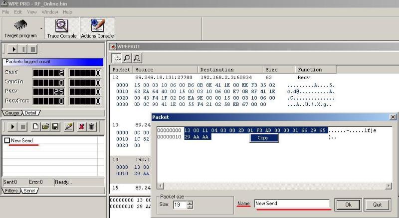 На скрине видно, что пакет поместился в закладку Send. Двойной клик мыши по нему приведет нас к окошку с самим пакетом. Для удобства переименуйте его. Затем выделите слева направо и пкм -> Copy