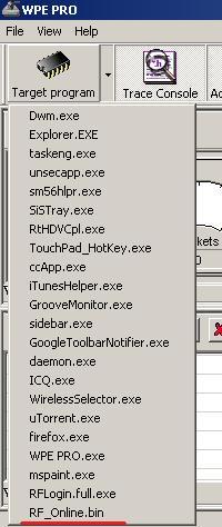 После того как включили, жмем в треугольник Target programm и выбираем процесс RF_online.bin.